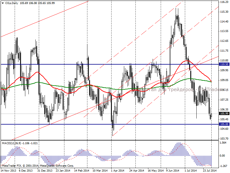 На торгах в четверг, 31 июля, нефть Brent продемонстрировала отрицательную динамику, по итогам дня снизившись до 106,02 долл/баррель и потеряв 0,46%. В начале дня некоторую поддержку котировкам оказала информация об очередном росте нестабильности в Ливии. Впрочем, попытка коррекции оказалась неудачной. Цена на Brent возобновила снижение на фоне сообщений о росте объемов добычи странами ОПЕК и снижения спроса на нефть в США.