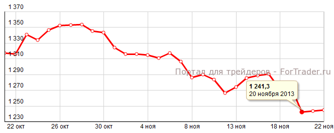 Цены на золото приостановили резкое падение, произошедшее в начале недели. Журнал ForTraders.org напоминает, что 20 ноября был достигнут новый минимум последних четырех месяцев в районе $1241,13 за тройскую унцию, упав сразу на 2,7% за день. Последний раз цена была ниже данной отметки 9 июля 2013 года.