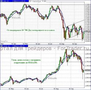 После выступления Бернанке в прошлую среду на рынках пару дней царила паника. Индекс Доу-Джонса на дневном графике вышел из восходящего канала и устремился вниз. Однако уровень 10 700, соответствующий августовскому минимуму, оказался достаточно сильной поддержкой, и Доу, успокоившись, снова двинулся вверх. Во вторник, 27 сентября, он вернулся в восходящий канал, границы которого снова могут служить ориентиром при планировании торговых операций.