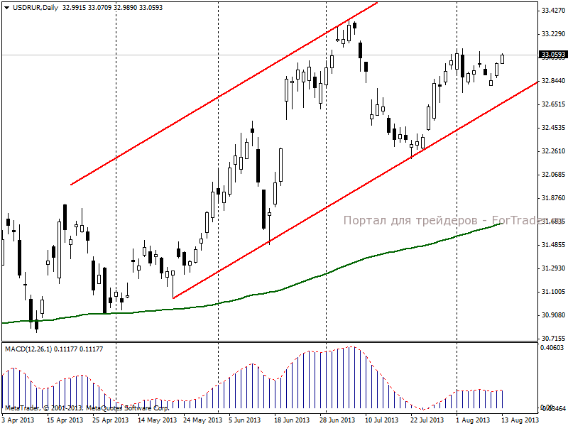 Официальный курс доллара США к рублю, установленный Банком России на 14 августа 2013 г., составляет 33,0426 руб/долл, что на 15,16 копейки больше предыдущего.