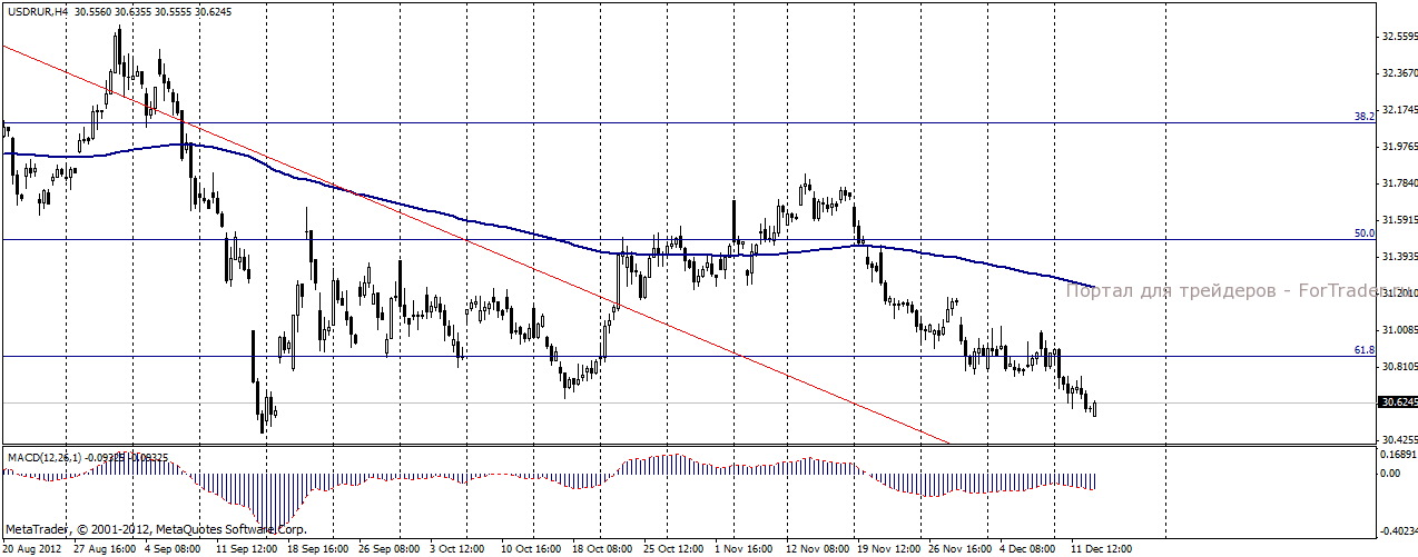 По мнению аналитиков журнала ForTrader, российская валюта будет пользоваться поддержкой высокого спроса на рисковые активы. Нефтяные котировки вряд ли окажутся подспорьем для укрепления рубля, так как отыграли результаты заседания FOMC еще вчера. По причине традиционного дорожания доллара к концу года в России серьезного укрепления российской валюты. Открытый до сих пор вопрос «фискального обрыва» в условиях ограниченного ресурса времени продолжит оказывать давление на рисковые активы и формировать негативные настроения инвесторов.