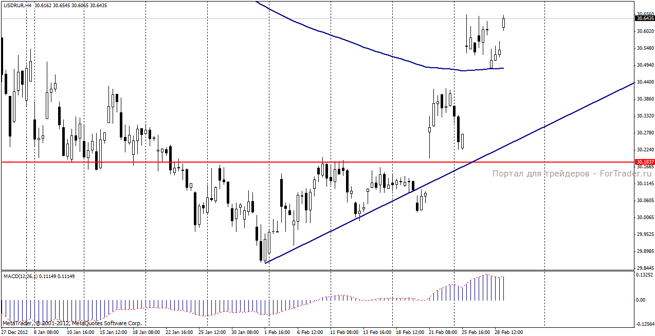По мнению аналитиков журнала ForTrader, факторов укрепления для российской валюты на сегодняшний день нет. Налоговый период, обеспечивающий повышенный спрос на рубль окончен. Увеличивающаяся вероятность автоматического секвестра бюджета в США будет создавать повышенную нервозность на рынке и выступать сдерживающим фактором для инвесторов.