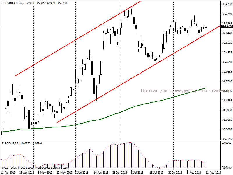 Сегодня, 21 августа, в первые минуты торгов на ММВБ, курс рубля снизился на 1 копейку до уровня 32,9658 руб/доллар. Из экономической статистики на курс рубля могут оказать влияние данные по продажам на вторичном рынке жилья в США. Ключевым событием дня станет публикация протоколов FOMC.