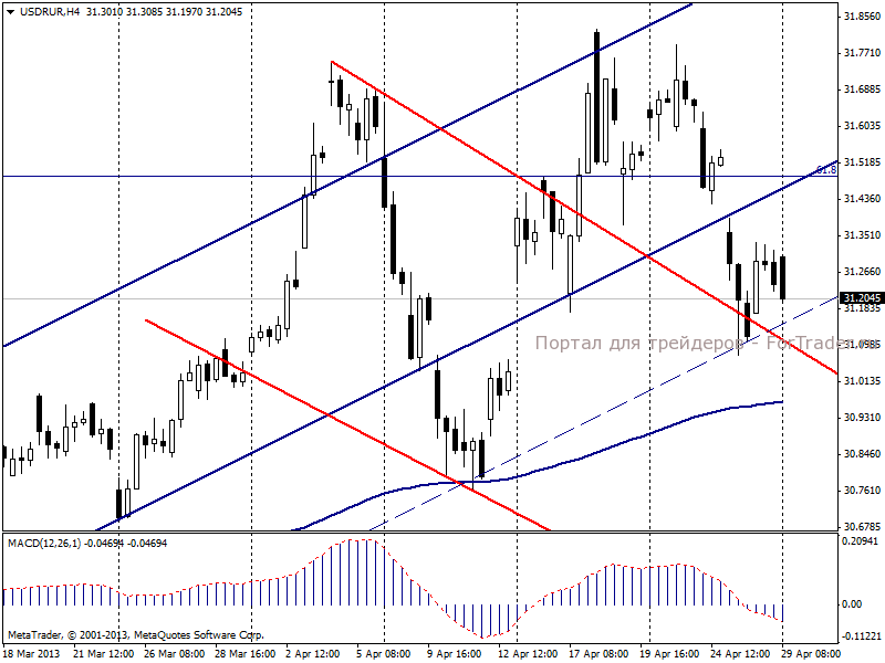 В пятницу, 26 апреля, рубль ослабил свои позиции против американского доллара. Негатив для рублевых котировок поступал со стороны снижающихся цен на нефть, однако публикация предварительных данных по ВВП США за 1-й квартал 2013 года несколько сдержала ослабление российской валюты.