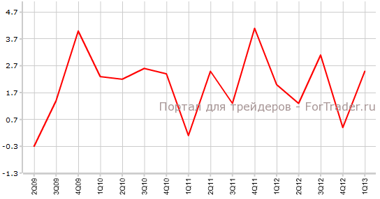 По предварительным данным ВВП США в первом квартале 2013 года вырос с 0,4% до 2,5%, не дотянув до прогнозируемого экономистами значения в 3%. Аналитики финансовых рынков прогнозируют, что пересмотренное значение ВВП США за первый квартал останется на том же уровне 2,5%.