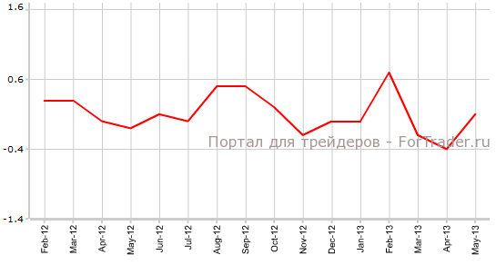 В мае индекс СPI США вырос с отметки -0,4% до уровня 0,1%, не дотянув до ожидаемого экономистами значения 0,2%. В июне 2013 года аналитики финансовых рынков прогнозируют дальнейший рост потребительской инфляции до уровня 0,3%.