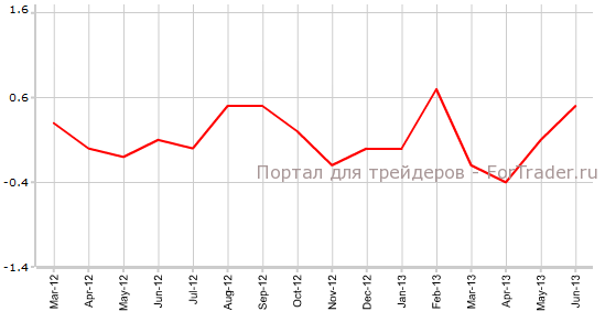 В июне индекс СPI США вырос с отметки 0,1% до уровня 0,5%, превзойдя ожидаемое экономистами значение 0,3%. В июле 2013 года аналитики финансовых рынков прогнозируют снижение потребительской инфляции до уровня 0,2%.