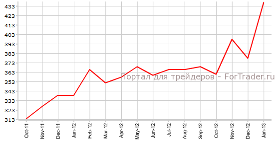 В январе 2013 года продажи нового жилья в США выросли до отметки 437K с уровня 378K, превзойдя прогнозируемое значение 381К. В феврале аналитики финансовых рынков прогнозируют снижение количества продаж новых домов до 426К.