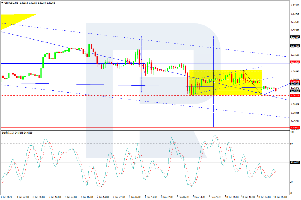 На графике H1 валютная пара GBP/USD развивает очередную волну снижения к уровню 1.3000. После его отработки не исключается звено коррекции к 1.3050. Далее ожидаем развитие очередной волны на снижение. С пробоем уровня 1.3000 вниз, откроется потенциал на снижение до 1.2910. Этот уровень рассматривается как локальная цель. Практически завершится третья волна снижения в пятой. После отработки этого уровня возможна коррекция с ростом к 1.3050. Технически такой сценарий подтверждает и осциллятор Stochastic. Его сигнальная линия находится под отметкой 50, что характеризует силу нисходящей тенденции.