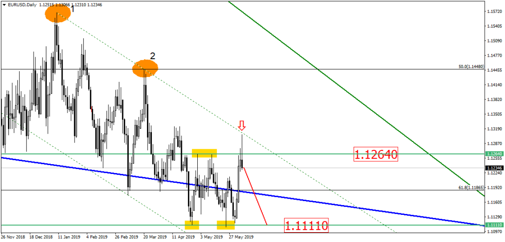 На дневном графике пары EUR/USD цена фактически коснулась нисходящего канала и, оставив длинную красивую тень, пытается закрыться ниже уровня 1.1264, оформив падающую звезду, которая также является медвежьим поглощением. Фактически, котировки оформили диапазон, противоположная граница которого – «магический» уровень 1.1111. В общем, базовый сценарий такой – краткосрочное потенциальное падение единой валюты.