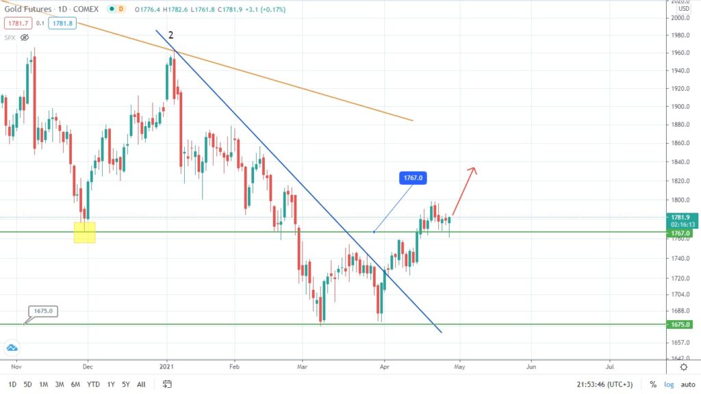Золото откатилось к пробитому уровню 1767.00 и сейчас формирует доджи, сигнализируя о желании продолжить восходящее движение и оставить позади нашу поддержку. Также стоит напомнить, что рост начался с образованного ранее двойного дна – сильной фигуры разворота тенденции: