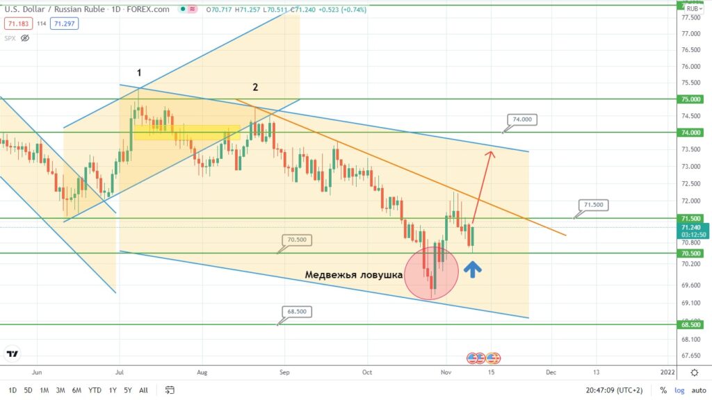 По паре USD/RUB цена протестировала горизонталь 70.50, отметив медвежью ловушку и закрывая среду бычьим поглощением. Базовый сценарий такой – пробой уровня 71.50 и дальнейшее движение в сторону линии нисходящего канала (ориентировочно до 73.50):