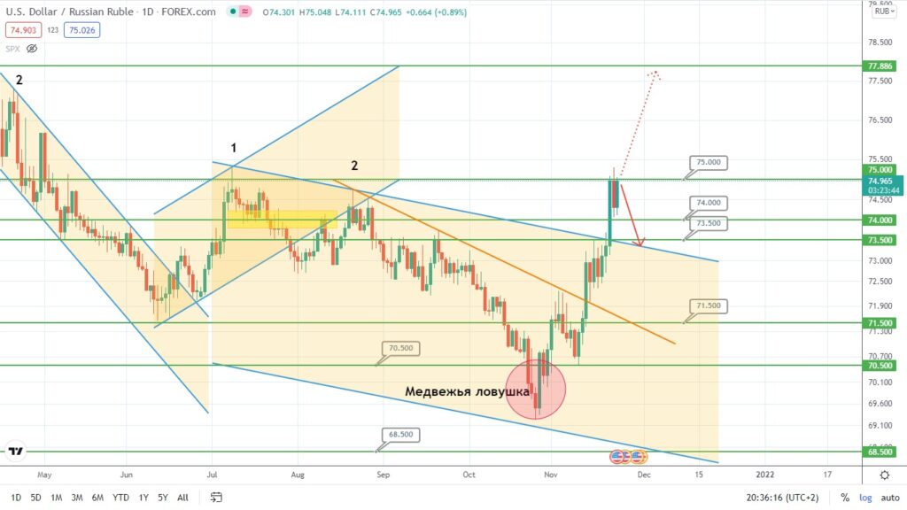Российский рубль коснулся уровня сопротивления 75.00 и теперь стоит перед выбором – или же отступить в сторону 73.50, или идти на пробой в сторону 77-й фигуры. Пока что оставляем базовым сценарием – первый вариант, тем более что был пробит нисходящий канал, от которого теперь котировки могут собрать силы на следующий рост: