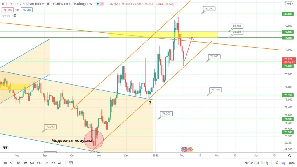 По российскому рублю котировки коснулись горизонтали 76.00 и линии восходящего канала. Потенциальный вариант развития ситуации – отскок от указанных линий и поход в сторону уровня 78.00. Сейчас видится ситуация только так – мелкими шагами: