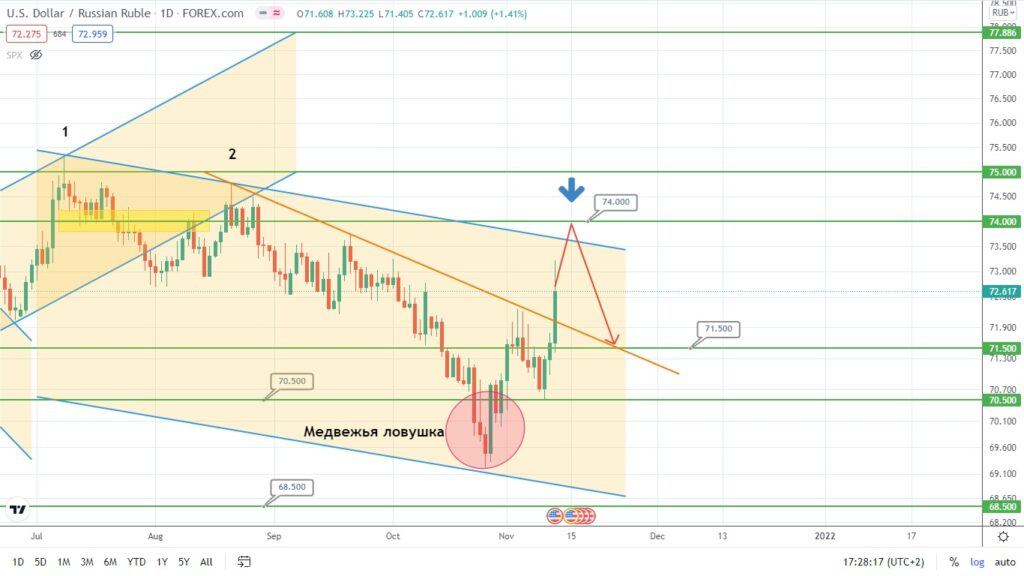 Пара USD/RUB активно росла на прошлой неделе и сейчас подходит к горизонтали 74.00, от которой у котировок есть все шансы оттолкнуться и поехать вниз. Потенциальные уровни падения – поддержка 71.50: