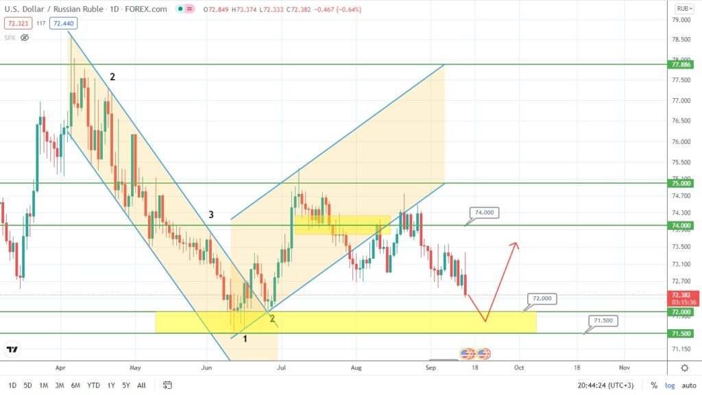 Российский рубль уверенно продвигается к области поддержки, сформированной между уровнями 71.50-72.00. Пока что эти уровни – ключевые, от которых стоит ожидать разворота котировок на север: