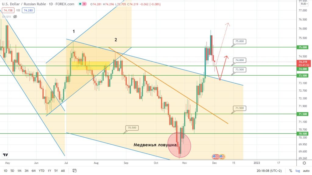 Российский рубль скорректировался в сторону уровня 74.00 и сейчас цена пытается восстановиться. В принципе, оставляем ещё вариант, когда цена «провалится» к поддержке 73.50 с последующим походом вверх. Ориентир роста – 76.00:
