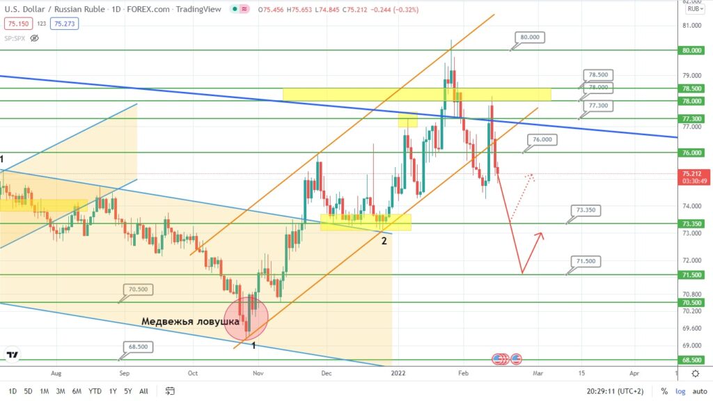 Российский рубль отошёл от 78-й горизонтали на фоне осторожного снижения геополитического градуса, при этом закономерно вспомнив про далее дорожающую нефть. Пара USD/RUB вылетела из своего восходящего канала и всё-таки устремилась вниз, где на котировки ожидают две интересные поддержки в виде горизонталей 73.35 и 71.50.