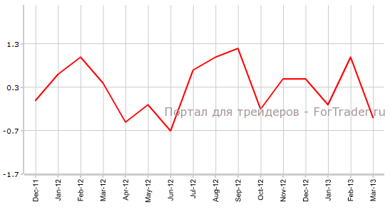 В марте изменение объемов розничных продаж составило -0,4%, снизившись с отметки 1,0%, превысив прогнозы экономистов, ожидавших их снижения до значения 0,1%. Аналитики финансовых рынков прогнозируют выход апрельского показателя Retail Sales на уровне -0,3%.