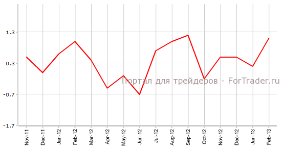 В феврале изменение объемов розничных продаж составило 1,1%, повысившись с отметки 0,4%, в то время, как экономисты ожидали их снижения до значения 0,2%. Аналитики финансовых рынков прогнозируют выход мартовского показателя Retail Sales на уровне 0%.