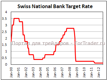 Швейцарский национальный банк оставляет значение процентной ставки на уровне 0% с августа 2011 года в попытке снизить стоимость франка, который пользуется спросом как валюта-«убежище», оказывая негативное давление на конкурентоспособность экспортируемых товаров. В попытке удержать курс жесткой привязки франка к евро на отметке 1,2000, финансовые институты страны, в том числе ШНБ проводят протекционную политику.