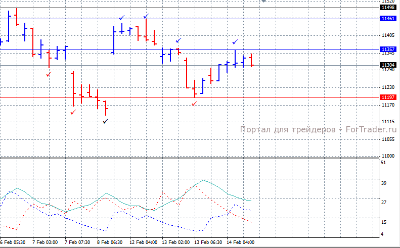 На часовом графике цена находится между уровнем сопротивления 11357 и уровнем поддержки 11197