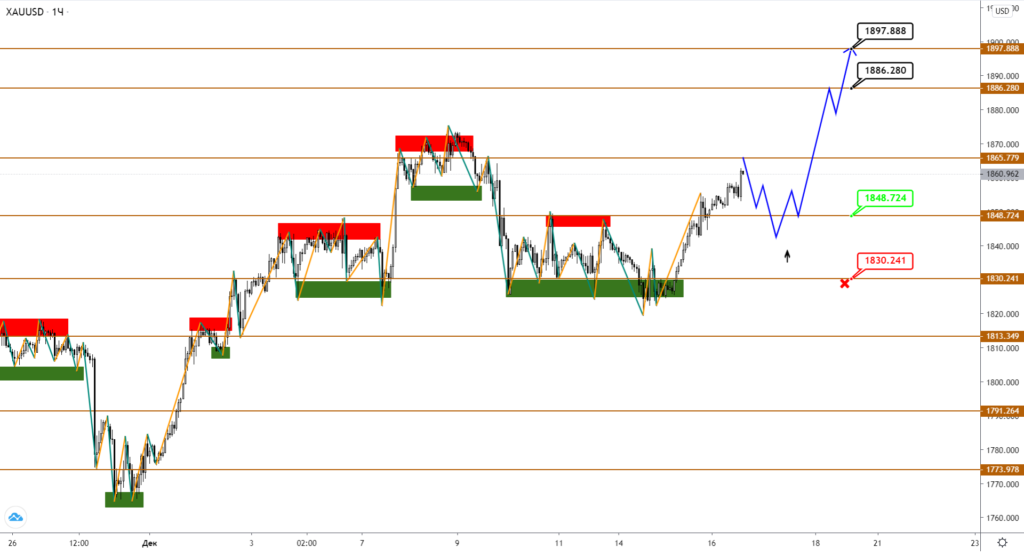 Для подтверждения намерений цены на рост может стать уверенное закрепление в текущей области. В рамках коррекции в случае ее развития предельным сигнальным уровнем выступает 1848, откуда необходимо будет ждать отбоя с последующим ростом выше предыдущего локального пика. Целью движения в этом случае выступает область между 1886 и 1897.