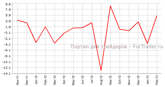 Согласно данным за февраль 2013 года заказы на товары длительного пользования США увеличились с отметки -3,8% до уровня 5,7%, превзойдя прогнозируемое значение 3,8%. В марте аналитики финансовых рынков прогнозируют снижение показателя до уровня -2,8%.