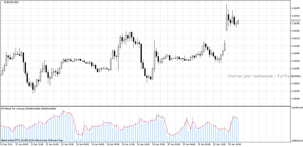Торговый индикатор Real Tick Volume для МТ5 показывает усредненное значение объема каждого тика, таким образом можно с легкостью определить точки входа крупных участников рынка либо определить тенденцию к увеличению, либо снижению наличия на рынке крупных игроков. Индикатор Real Tick Volume может использоваться практически на любом таймфрейме и финансовом инструменте.