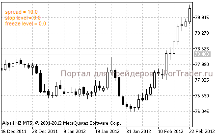 Spread on chart – графический форекс индикатор для терминала MT 5, который отображает на открытом ценовом графике валютной пары или другого инструмента текущее значение спреда, stop level (значение минимального расстояния от текущей цены до возможных Stop Loss и Take Profit) и freeze level (значение минимального расстояния от текущей цены до ордера, который есть необходимость модифицировать, отменить или закрыть).