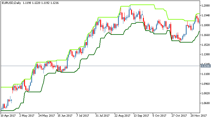 Верхняя и нижняя полосы определяют канал, который движется вместе с ценовыми барами. Название индикатора происходит от Turtle Traders (трейдеры-черепахи), которые использовали канал для сигналов входа и выхода своей торговой системы.