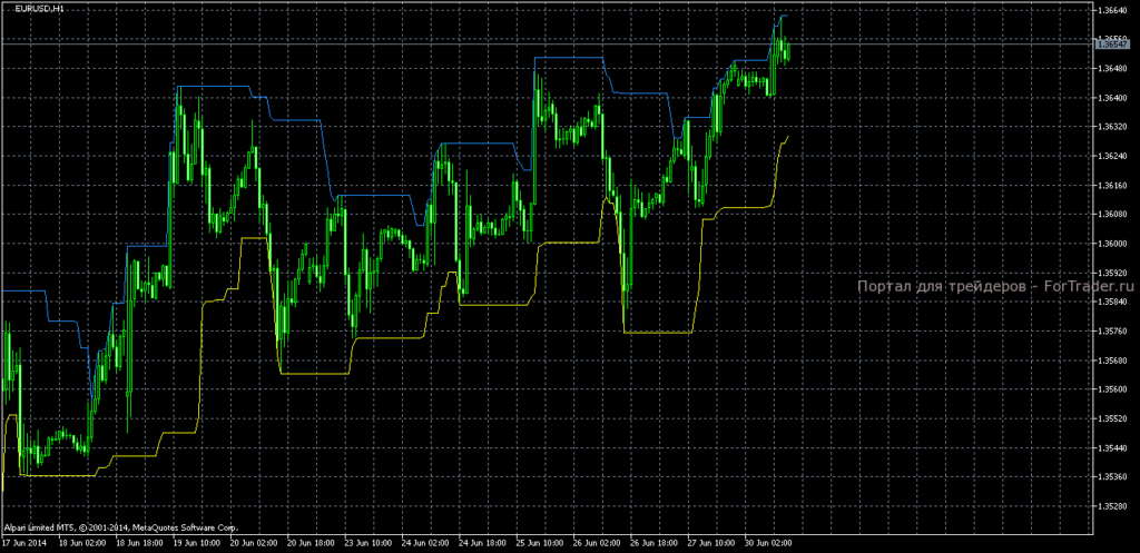 Торговый индикатор RecentHigh/LowAlert отображает две линии — уровни максимума и минимума на последних N барах. По умолчанию, линия максимума показана синим цветом, а линия минимума — желтым. Также, индикатор может проигрывать звуковой файл, вызывать всплывающее уведомление и отсылать сообщение по электронной почте, когда текущая цена пробивает уровни недавних максимума или минимума. Все уведомления могут быть отключены. Если вы планируете использовать уведомление по электронной почте, то соответствующие данные должны быть внесены в окне настроек вашей платформы МетаТрейдер.