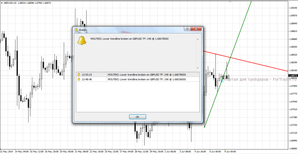 При пробитии ценой восходящей линии Демарка сверху вниз индикатор выводит окно оповещения о том, на каком таймфрейме это произошло и значение цены при пересечении.