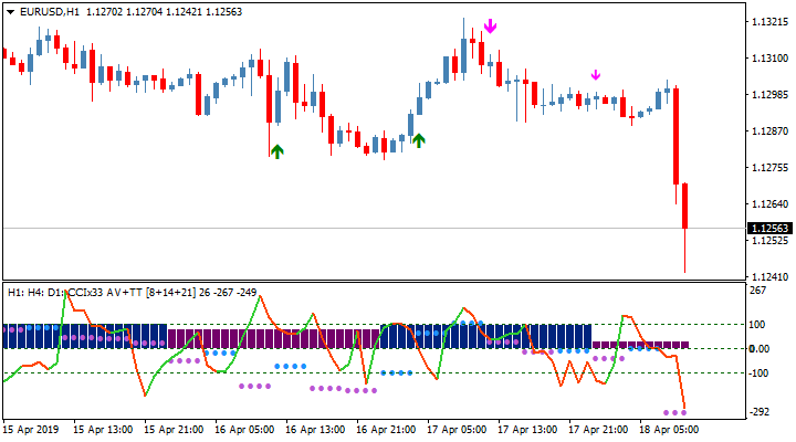 Индикатор CCIx3 AA MTF RP+NRP AV+TT имеет возможность гибкой настройки стрелок и сигналов, которые не привязаны друг к другу, различные варианты отображения линий и гистограммы, систему алертов и многое другое.