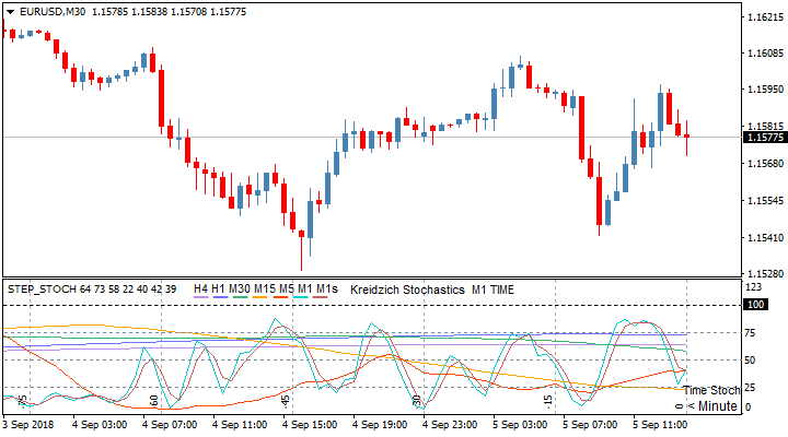 Торговый индикатор Step Stoch отображает в подвальной части графика движение всех Стохастиков с таймфреймов М1-Н4 каждую минуту.