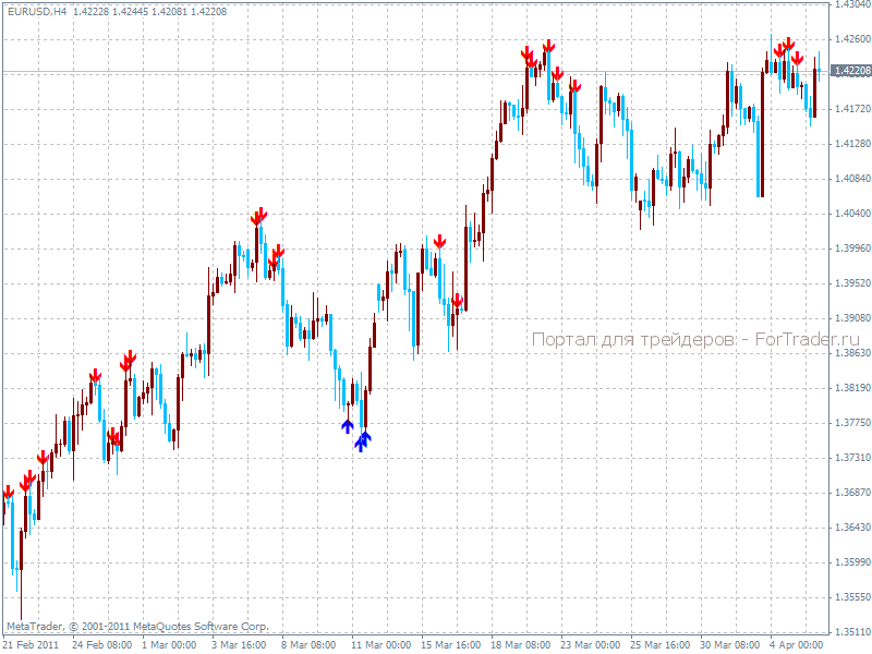Красная стрелка – сигнал на продажу, синяя – на покупку. Стоит отметить, что может быть и несколько подряд одноцветных стрелок, соответственно возможно либо докупаться в этих позициях, либо, если вы берете небольшие профиты, открываться повторно.
