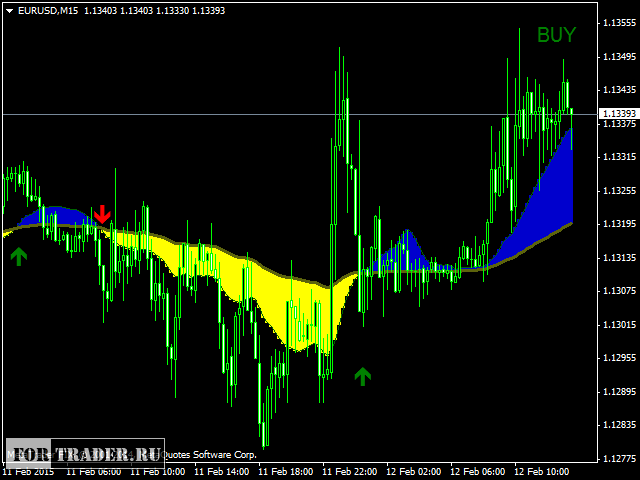 Сигнальный индикатор форекс MA ribbon filled_Alerts выводит на ценовой график валютной пары сигналы о пересечении двух скользящих средних в виде стрелок. При этом пространство между скользящими средними окрашивается в зависимости от из взаимного расположения.