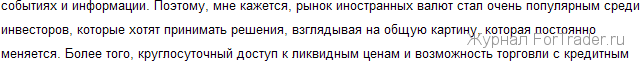 К.Т.: Я думаю, что рынок Forex является основным. Новости и события со всех стран мира имеют большое влияние на него. Причем происходит это все быстрей и быстрей и в любое время суток. В каком-то смысле, это как сравнивать марко- и микроэкономику. Форекс назовем «макро-» — он зависит от более обширных факторов, а все остальные рынки – «микро-» и сосредоточены на определенных