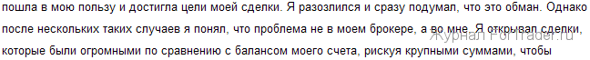К.Т.: Я помню, когда мои сделки на рынке Forex первый раз «ликвидировались» (принудительное закрытие торговой сделки, когда маржа, необходимая для поддержания открытых сделок превышает доступную маржу на счете), чувство было совершенно отвратительное. Цена буквально через три пункта