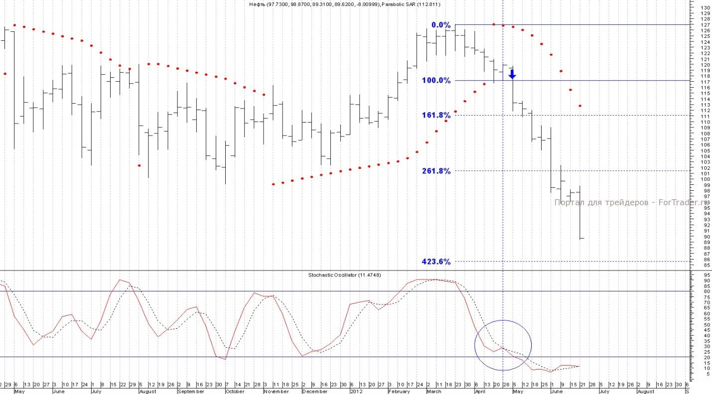 На недельном графике фьючерсов на нефть марки Brent хорошо виден устойчивый нисходящий тренд, который идентифицируется при помощи направления движения медленной линии %D стохастического осциллятора (на графике обозначена черной пунктирной линией).