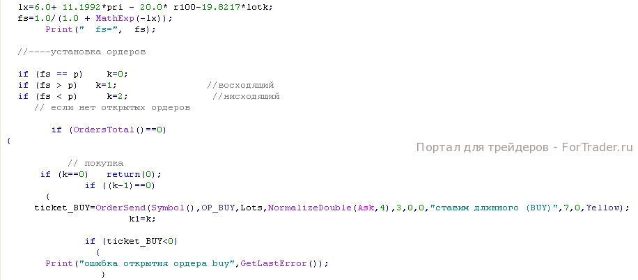 Программирование стратегии осуществляется в редакторе MetaEditor на языке MQL4. Разработана МТС – программа-советник, способная осуществлять торговые операции в реальном режиме времени. Фрагменты кода советника приведены на рис. 1 – открытие позиции и рис. 2 – закрытие позиции на покупку по сигналу индикатора. Торговля ведется 1 –м лотом, начальный депозит — $10000, без комиссий, остальные настройки терминала – стандартные.