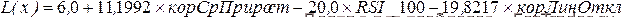 Для идентификации точки разворота и областей тренда используем средний темп роста и прироста цены закрытия за n=10 последних баров. В модели – это переменная корСрПрирост, к которой применено преобразование. Знак значения индикатора идентифицирует направление тренда: «+» – восходящий, «-» – нисходящий тренд; смена знака предупреждает о развороте тенденции. Для восходящего/нисходящего тренда средний прирост (цен закрытия за последние 10 периодов) увеличивается с ростом/падением цены и уменьшается при корректировке цены. Формулы расчета значений переменных приведены в указанной выше работе автора.
