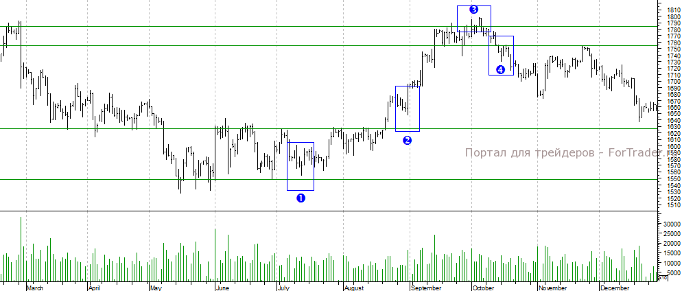 На дневном графике фьючерсов на золото у нижней границы торгового канала была образована модель «1-2-3» (фрагмент 1). После чего возникли три повышающихся минимума («Три касания»), средний и последний из которых ознаменовались формированием пин-бара. Это давало хорошие шансы на вход от нижней границы диапазона консолидации.