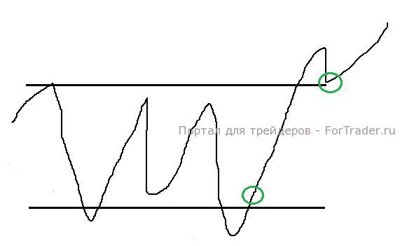 Кроме того, следует иметь в виду, что движения вниз с неудачным тестом поддержки перед движением вверх с последующим прорывом торгового диапазона может вовсе не быть. Ожидая подобное действие, можно пропустить сделку.