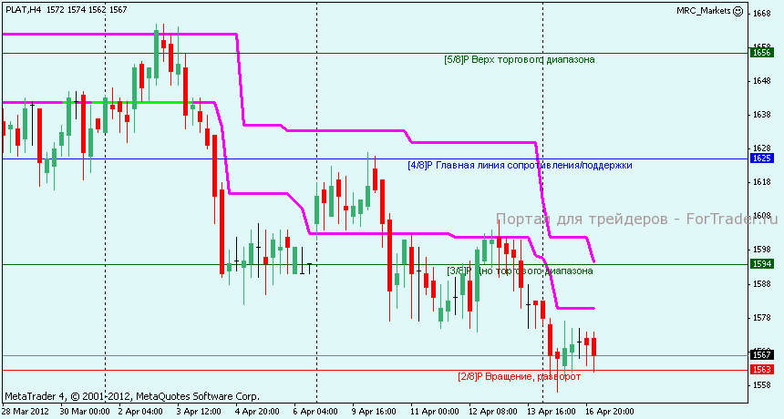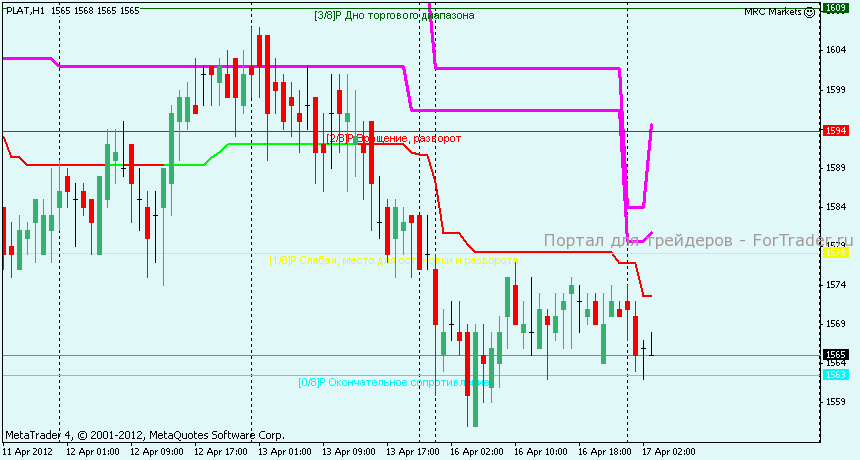 PLAT находится в нисходящем движении, в настоящий момент падение цены остановилось на уровне поддержки 1563, в ближайшее время возможно продолжение бокового движения около этого уровня, в случае уверенного пробоя этого уровня можно будет говорить о продолжении нисходящего тренда.
