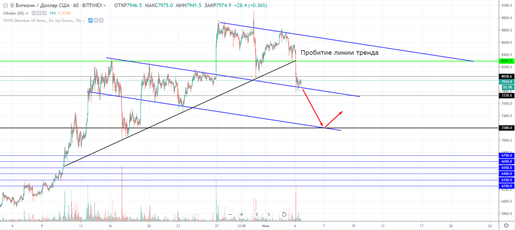 Параболический тренд, в котором график BTC/USD торговался последние месяцы, был пробит. Настрой покупателей явно не такой воодушевленный, как был раньше. После прокола уровня $9000, главная криптовалюта импульсно потеряла в цене почти $1000 в моменте, однако потом покупателям удалось вернуть цену до $8800. Пробитие среднесрочной линии тренда произошло во вторник 4 июня. Ещё один медвежий импульс переломил тенденцию, биткоин потерял порядка $500и опустился ниже $8000.