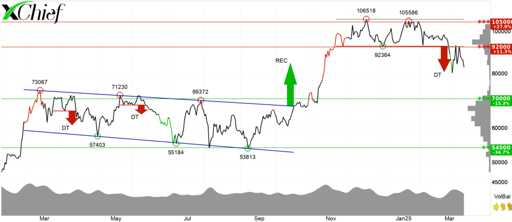 Биткоин продолжает снижаться, достигнув отметки $82 000, что стало очередным звеном в цепи потерь на фоне слабого рыночного интереса к последним инициативам Дональда Трампа. Создание стратегического резерва биткоина и проведение саммита в Белом доме не принесли ожидаемого позитива, а неопределенность вокруг экономики США и торговых тарифов только усилила давление на рисковые активы.