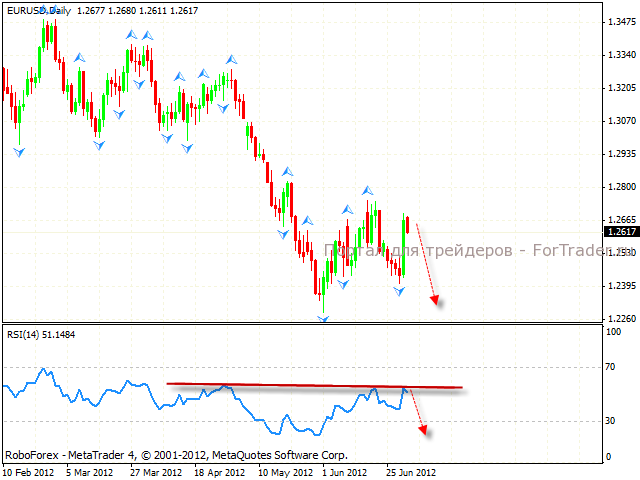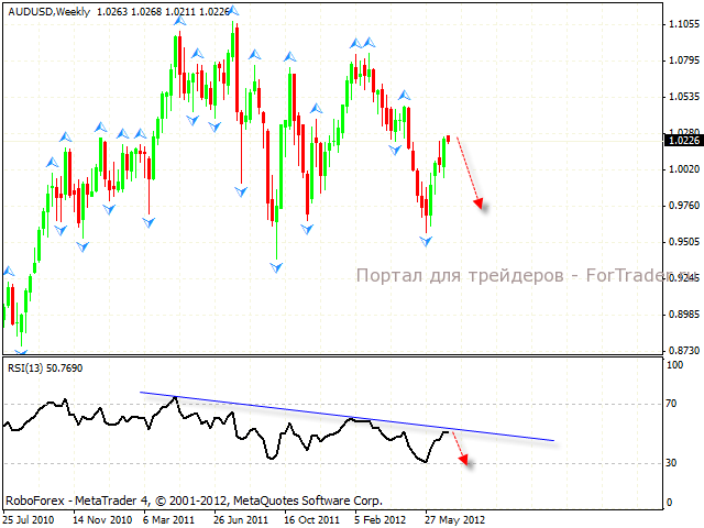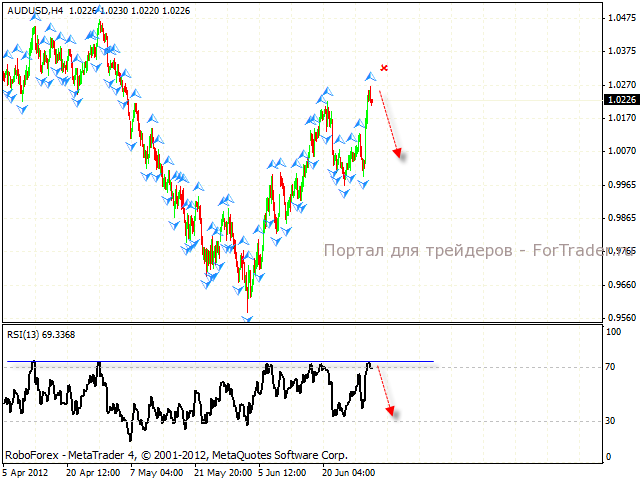 Четырехчасовой график пары также указывает на падение. Значения Индекса относительной силы тестируют сильный уровень сопротивления. Стоит ожидать падения. Можно рассматривать продажи австралийского доллара с текущих уровней с близким стопом выше 1.03.