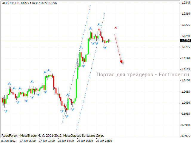На часовом графике пары формируется разворотная модель «Голова и плечи». Также цена покинула пределы восходящего канала, что указывает на потенциальное падение. Можно рассматривать агрессивные продажи от уровня 1.0250. Наращивать объем коротких позиций стоит с пробитием уровня 1.0205.