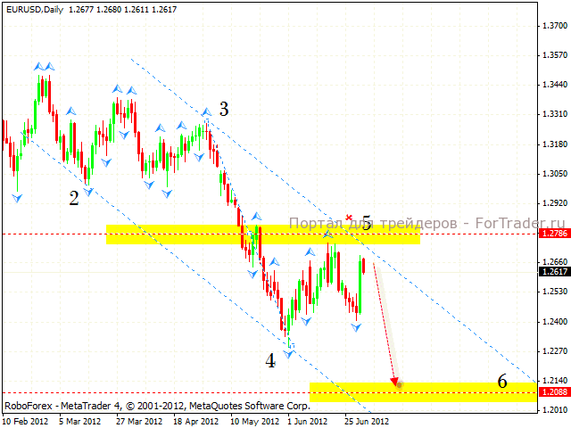 Валютная пара евро/доллар в целом продолжает движение в рамках нисходящего канала. Структура движения цены подразумевает формирование зеркальной модели с центром в области 1.2785. На данный момент подходит к завершению формирование 5-й опорной точки, откуда стоит ожидать начала завершающей волны падения.